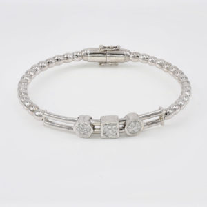 White Gold And Diamond Bead Slide Bracelet$3,275.00$3,275.00 18kt white gold bead slide bracelet. Magnetic closing with two safeties on either side. Round,square and flower diamond moving pieces. 23 diamonds- .40cts. G-H color. VS2-SI1. Also have pink and yellow gold available. Contact Us