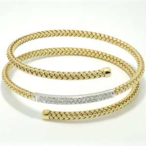 Wrap Bracelet$4,900.00$4,900.00 14kt wrap bangle 14kt yellow and white gold. 35 dia- .53cts H-I color VS2-SI1 7"-7 1/2" wrist size. 27mm wide 3.3mm each section. $4900 Contact Us