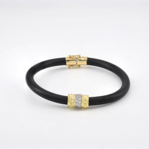 Diamond barrel rubber bracelet$1,800.00$1,800.00 Black rubber bracelet and 18kt yellow and white gold. Magnetic closing with two safeties on either side. 22 diamonds-.44cts. G-H color. VS2-SI1 14.5mm long and 9.5mm wide. Can be sized to fit. $1,800 Contact Us