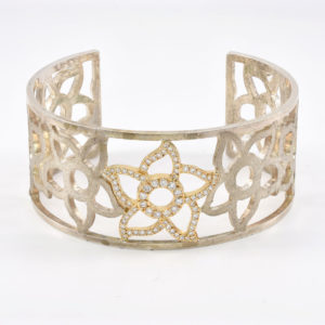 Silver & gold flower bangle$3,975.00$3,975.00 Sterling silver and 18kt yellow gold flower bangle. 62 diamonds- 1.35cts. G-H color. VS2-SI1 29mm wide. $3,975 Contact Us