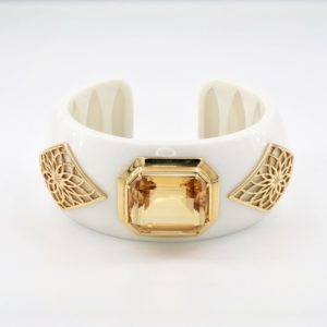 Citrine white resin wide cuff bracelet$3,000.00$3,000.00 Emeraled cut Citrine apprx 36cts. (21.5mm X 17.5mm). 18kt yellow gold. Made with white resin. Fits 7- 7 1/2 wrist size. Can be made to fit. $3,000 Contact Us