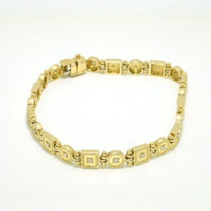 Square & Circle Bracelet$2,775.00$2,775.00 18kt square and circle flexible bracelet 18kt yellow gold. 23 dia-.25cts H-I color VS2-SI1 5.5-5.6mm 7'' wrist size $2775 Contact Us