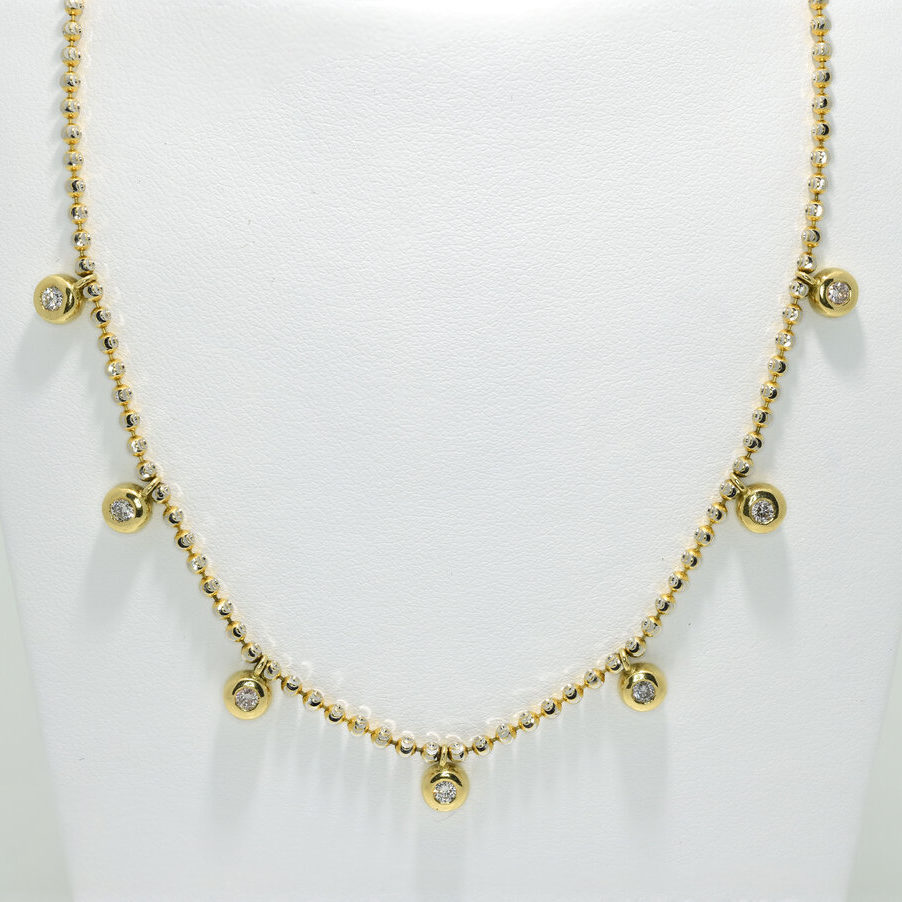 14kt and 18kt yellow and white gold. 7 dia- .45cts H-I color VS2-SI1. 18kt yellow bezel settings. 14kt diamond cut bead chain. 16″ (18″ and 20″ available)