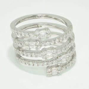 Diamond spiral ring$5,200.00$5,200.00 Diamond spiral 18kt white gold ring. 75 round diamonds- 1.21cts. 10 baguettes- .50cts. H-I color. VS2-SI1. Size: 6 1/2-6 3/4. Can be ordered in different sizes. Contact Us