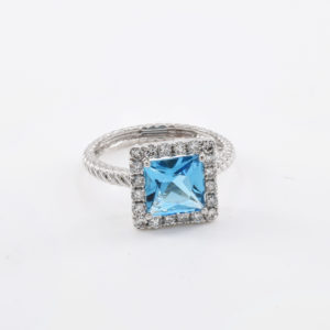 Square Blue Topaz and Diamond Ring$1,600.00$1,600.00 Beautiful Swiss blue topaz and diamond ring. 18kt white gold. 20 diamonds-.54cts. Blue Topaz-2.55cts. G-H color. VS1-VS2. 8mm square topaz. Any ring can be sized to fit. Contact Us