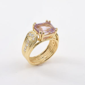 Lavender Amethyst Ring$3,400.00$3,400.00 Beautiful lavender Amethyst and diamond ring. 18kt yellow gold. Amethyst- 5.84cts. 14 diamonds- .54cts. G-H color. VS1-VS2. Any ring can be sized to fit. Contact Us
