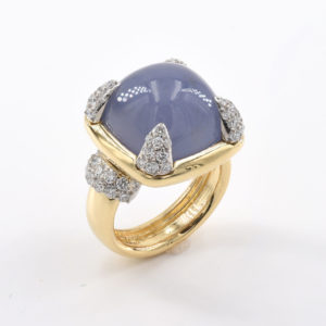 Cabochon Blue Chalcedony Diamond Ring$4,750.00$4,750.00 Gorgeous cabochon blue Chalcedony diamond ring. 18kt white and yellow gold. Chalcedony- 17.70 cts. 69 diamonds- 1.36cts. G-H color. VS1-VS2. Any ring can be sized to fit. Contact Us