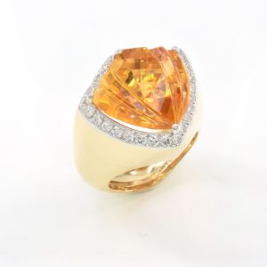 Carved Citrine Diamond Ring$3,950.00$3,950.00 18kt yellow gold carved Citrine ring. Citrine:12.73cts. 25 Diamonds: .58cts. G-H color. VS1-VS2 Ring can be sized to fit. Contact Us