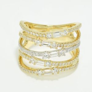 Diamond multi row ring$5,400.00$5,400.00 Diamond multi row 18kt yellow and white gold ring. 116 diamonds- 1.22cts. G-H color. VS2-SI1. 15.8mm top narrows to 6.6mm Contact Us