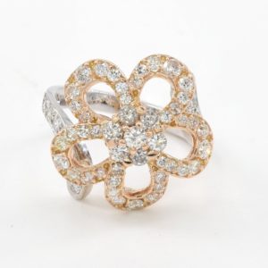 Pink & White Gold Diamond Flower Ring$2,975.00$2,975.00 18kt pink and white gold diamond flower ring. 59 round diamonds- 1.55cts. H-I color. VS2-SI1 Flower is 18mm. Any ring can be sized to fit. Contact Us