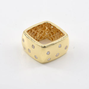Scattered diamond square ring$3,900.00$3,900.00 18kt yellow gold and scattered diamond ring. 19 diamonds-.86cts. G-H color. VS1-VS2 Size: 7-71/2 $3,900 Contact Us