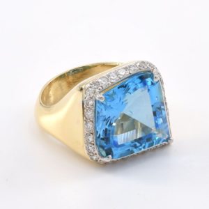 Blue topaz diamond ring$4,450.00$4,450.00 Swiss blue Topaz diamond ring. Kite shape- step cut topaz appr.21cts. 18kt yellow gold. 32 diamonds-.78cts. G-H color. VS1-VS2. Any ring can be sized to fit. $4,450 Contact Us