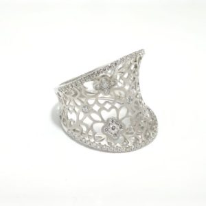 Diamond Lacey Design Ring$5,000.00$5,000.00 diamond lacey design ring 18kt white gold. 81 dias- 1.03cts H-I color VS2-SI1 25mm wide at top. Satin and shiny finish. Size: 6 1/2. Any ring can be sized to fit. $5,000 Contact Us